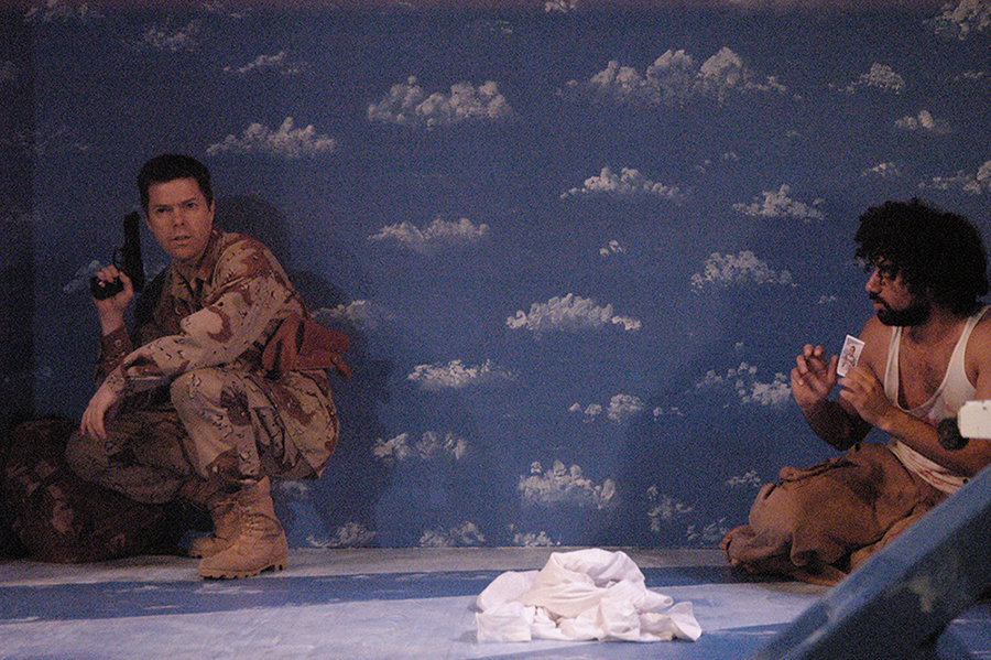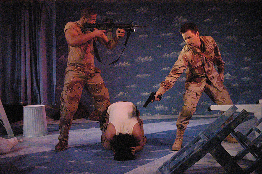 From the original production of Duty Honor Country, Clinton Faulkner, Moussa Kraish, and Kevin Draine perform Off Broadway at The Drilling Company Theatre in New York City, June, 2004. The director was Edwin Owens. Photos by John Pollack.The Iraq War era short play was published by The New York Theatre Experience in the anthology, Plays and Playwrights 2005, edited by Martin Denton.
